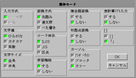 オプション・パネルのチェック・ボックスをクリックして、入力方式、文字種、全角・半角の切り替えができます。