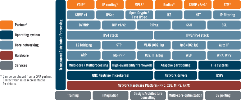 QNX ソフトウエア システムズは、標準的な業界の実装に基づいて、ネイティブ サポートするネットワーキング プロトコルを数多く提供しています。これらのスタックは QNX Neutrino RTOS に統合済みで完全にテストされており、開発時間の短縮と市場投入の早期化を実現します。また、多くのサード パ 12540;ティ プロトコル ベンダーは、VOIP、IP ルーティングなどを事前統合した製品を提供しています。