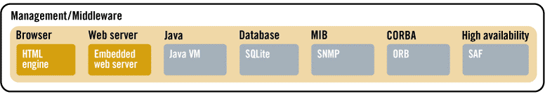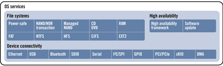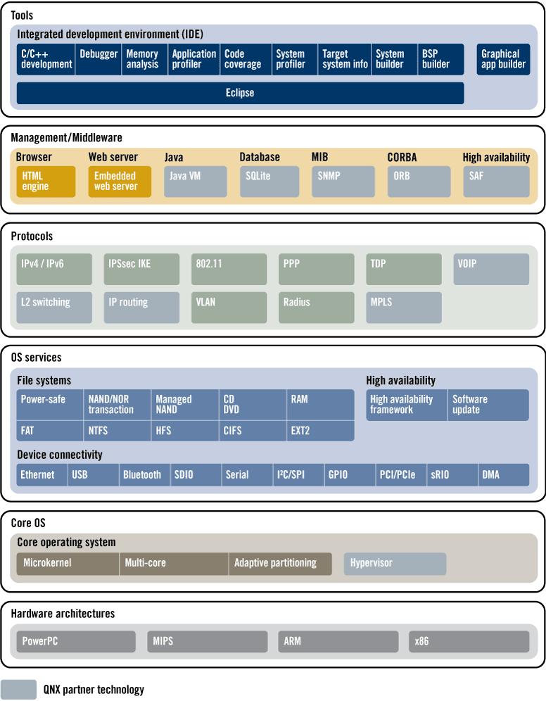 このレイヤは QNX ソフトウエア システムズと成長を続けるパートナーネットワークによって提供され、SNMP、サービス アベイラビリティ フォーラムの HA、Corba、および Web サービスなどの主要なサービスを提供します。
